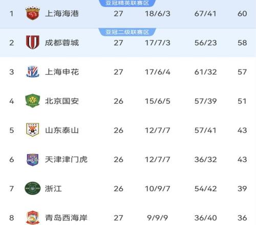 申花21取胜!蓉城海港也赢了,中超最新积分:2队争冠+降级4选2