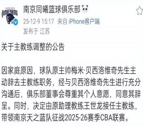 CBA新赛季还没有拉开大幕,就有球队更换了主帅,南京同曦方面官宣,由于贝西诺维奇个人原因辞职,王世龙成为南京同曦新任主帅,不过根据媒体报道,南京同曦方面是不满意贝西诺维奇在CBA俱乐部杯的表现,后续沟通不理想导致了。