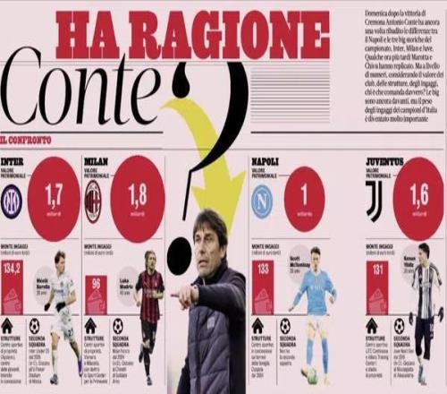 这里除了球员身价带来的差距外,最重要是球队固定资产的差别。四支球队里,北方三强都有自己的训练基地和球场,当然尤文是从都灵市政府获得了球场99年的租借权,而米兰双雄收购梅阿查球场的程序已经在推进中,后续两队将重建新的专业球场,届时两队拥有的球场资产价值及附带的商业价值还会有不小的提升。而那不勒斯不仅没有自己的球场,甚至连训练基地都没有!目前,那不勒斯的训练中心依然是租借的,而且训练中心内没有提供球员休息的房间,如果孔蒂安排一天内上午和下午的双训练时,球员中间都需要回家休息。不过,那不勒斯主席德劳伦蒂斯已经购买了一块土地用于建设训练中心,不过最快也要2028年才能建成投用。 虽然在球队价值方面差距巨大,但在薪资总额方面却并非如此。目前国米的薪资总额为1.342亿欧,是意甲薪资总额最高的球队,但跟上赛季相比微降0.7%;排名第二的就是那不勒斯,本赛季他们的薪资总额已经达到了1.33亿欧,相比上个赛季大幅增加了4100万欧。尤文和AC米兰分别以1.31亿欧、9600万欧分列三四。