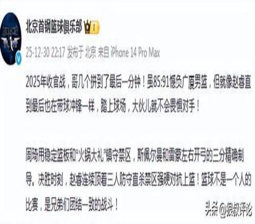 北京时间12月30日,CBA迎来焦点大战,北京主场迎战广厦,这也是上个赛季的总决赛队伍,双方经过四节的激战,广厦的核心外援布朗再次站出来,他拿到广厦最后13分里的11分,帮助球队送北京首钢赛季首败。那两记三分球决定了比赛,一次挡拆侧撤步三分,投周琦沉退,一次拆炸弹超远三分。 赛后,涉及到外援层面的差距引发外界的热议。 北京官方更新发文:“2025年收官战,哥几个拼到了最后一分钟!虽85:91憾负广厦男篮,但就像赵睿直到最后也在带球冲锋一样,踏上球场,大伙儿就不会畏惧对手!” 周琦用稳定篮板和“火锅大礼”镇守禁区,斯佩尔曼和雷蒙左右开弓的三分精确制导。决胜时刻,赵睿连续顶着三人防守直杀禁区强硬对抗上篮!篮球不是一个人的比赛,是兄弟们团结一致的战斗!” 球迷对于北京男篮主场输球并不满意,特别是涉及到决战时刻的外援能力差距。 有球迷点评说道:外援赶紧换换换,把赵睿累坏了。 去年总决赛就看出来了,时隔一年,毫无作为在外援问题上。 赶紧来个好外援吧,要不今年又白忙活了。 场场让赵睿周琦那么打怎么可能呢!!天南地北的三连客场,再加上连续三场高强度比赛,确实要累死了….期待下场阿基和小曾的回归!再说一万遍既然争冠是目标,那外援问题就是重中之重!别浪费那么好的国内球员!最后希望大家2026年健健康康,一定能拼到那个冠军。 还是输在一些细节的处理上,比如失误和罚球,但面对卫冕冠军能有这样的表现,能感受到大家尽力了,何况我们刚经历了三连客的舟车劳顿,主力球员也不齐整,回去抓紧好好休息,下场还是硬仗,加油! 此前,奥莫特离队后,许利民接受媒体采访,谈到最新的外援引进方面表示:目前球队还在筛选阶段,要涉及合同报价,适配度等多方面的因素决定。 |