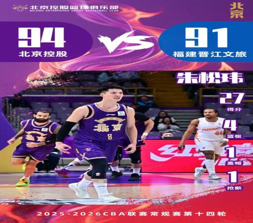 1.12 1月12日,北控男篮坐镇主场迎战福建晋江文旅。本场比赛球队开局进攻流畅防守严密,一度领先对手多达21分。下半场福建男篮进攻回暖,凭借曾凌铉连续三分命中一度追平比分。关键时刻廖三宁挺身而出,用一记三分绝杀帮助球队以94:91收获关键胜利。 数据方面,朱松玮拿下全队最高的27分;里勒稳定发挥斩获26分5助攻2抢断,廖三宁奉献11分10助攻的两双数据。 最佳数据