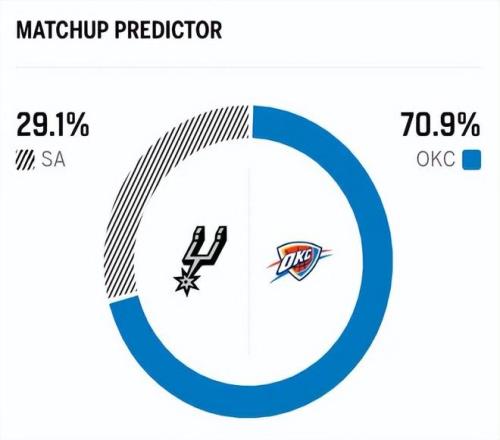 赛前,美媒ESPN对本场比赛进行了胜率预测,马刺队胜率仅有29.1%,依旧不被看好,雷霆队胜率则高达70.9% ,显然美媒都看好雷霆本场能够打破“魔咒” ,完成复仇之战。 首发阵容方面,马刺队这边,瓦塞尔因伤确定缺阵,文班亚马因左小腿伤病管理可能会有出场时间限制,教练排出的最新首发五人组为:福克斯、尚帕尼、卡斯尔、巴恩斯、文班亚马;雷霆队这边,哈腾缺阵,首发阵容则为:亚历山大、杰伦-威廉姆斯、华莱士、威金斯、切特-霍姆格伦。